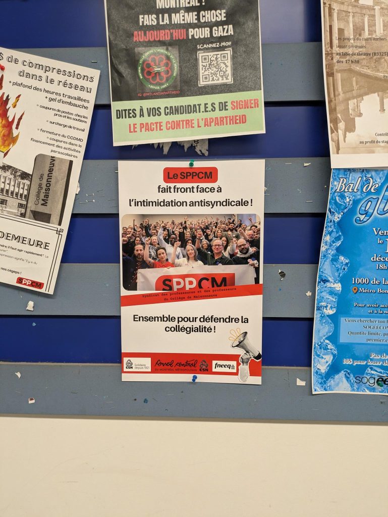 En réponse aux suspensions, l’association étudiante s’est organisée de manière collective et soutenue. Depuis les deux dernières semaines, dur est d’ignorer la contestation au sein de l’établissement : deux manifestations ont eu lieu à l’intérieur du Collège, une campagne de collants « Lever les sanctions » a également été menée, avec des affichages massifs dans plusieurs espaces, de concert avec la confection de bannières ainsi que de macarons et de tracts dénonçant la répression. Une pétition exigeant la fin des sanctions circule toujours, témoignant d’un appui qui continue de s’élargir. Cette mobilisation a aussi trouvé des échos au sein du personnel. Le syndicat des professeures et professeurs a sorti une affiche arborant un titre clair : « Le SPPCM fait front face à l’intimidation antisyndicale ».
