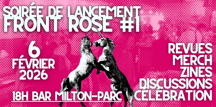 Vous êtes invité·es au lancement de l’Édition #1 du magazine Front Rose, qui aura lieu le 6 février 2026 à 18h au bar coop BMP (3714 avenue du Parc).
